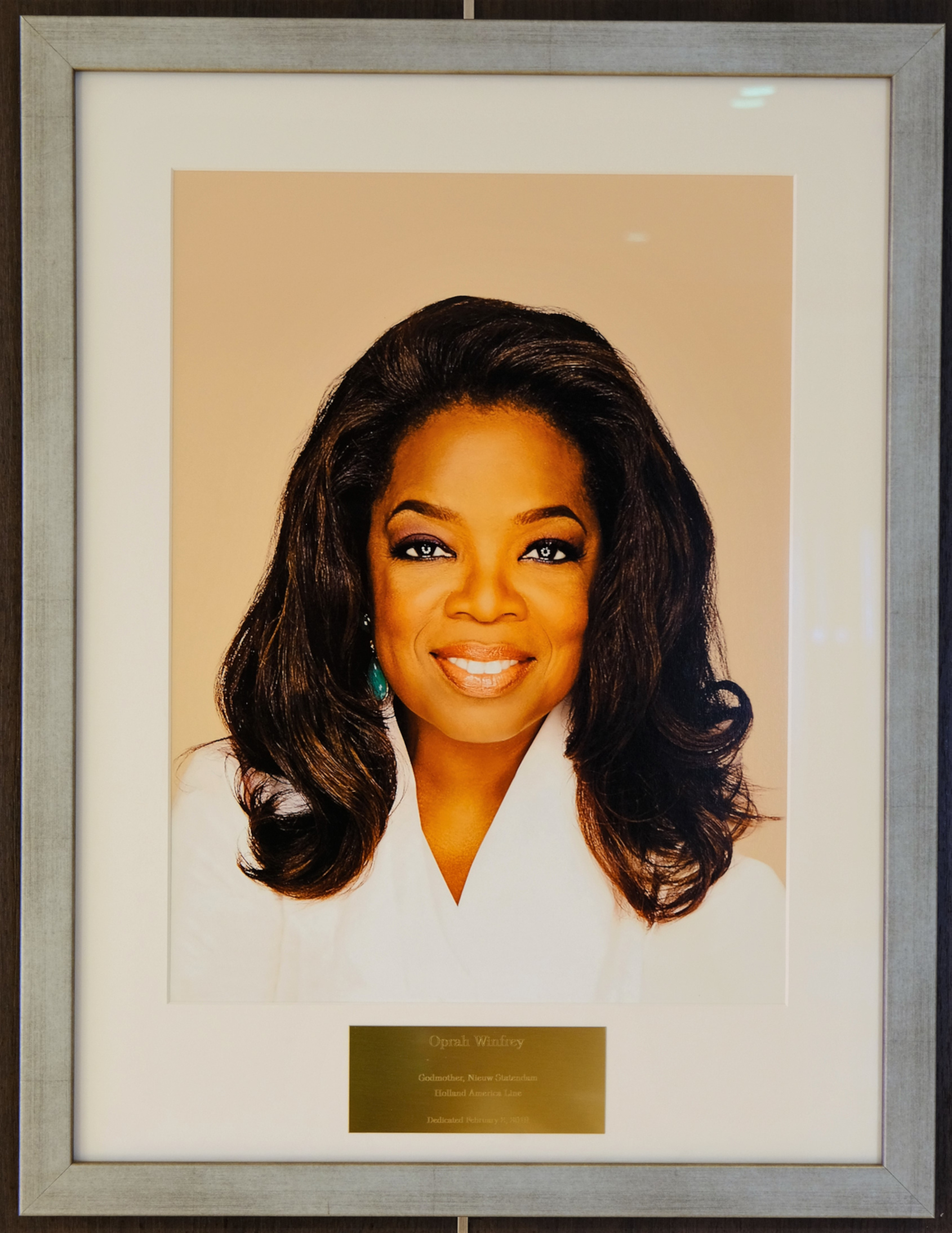 We beginnen de tour in het atrium op dek 3, waar een foto hangt van de doopvrouw Oprah Winfrey. Zij heeft het schip gedoopt op zaterdagavond 2 februari 2019. Op de plaquette staat de datum van 8 februari 2019.