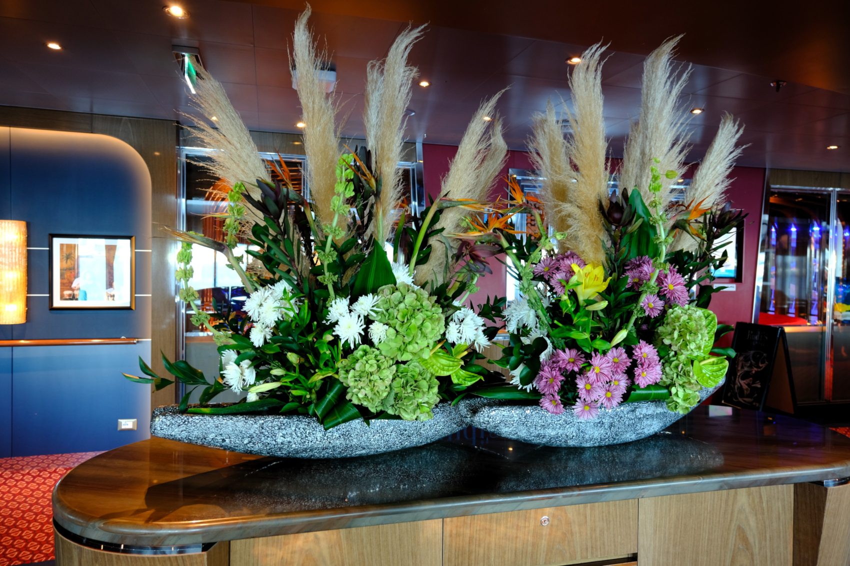 Bloemstukken over het hele schip. Dagelijks goed verzorgd en eventueel vervangen