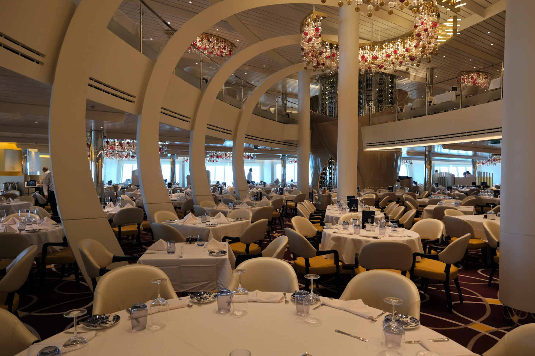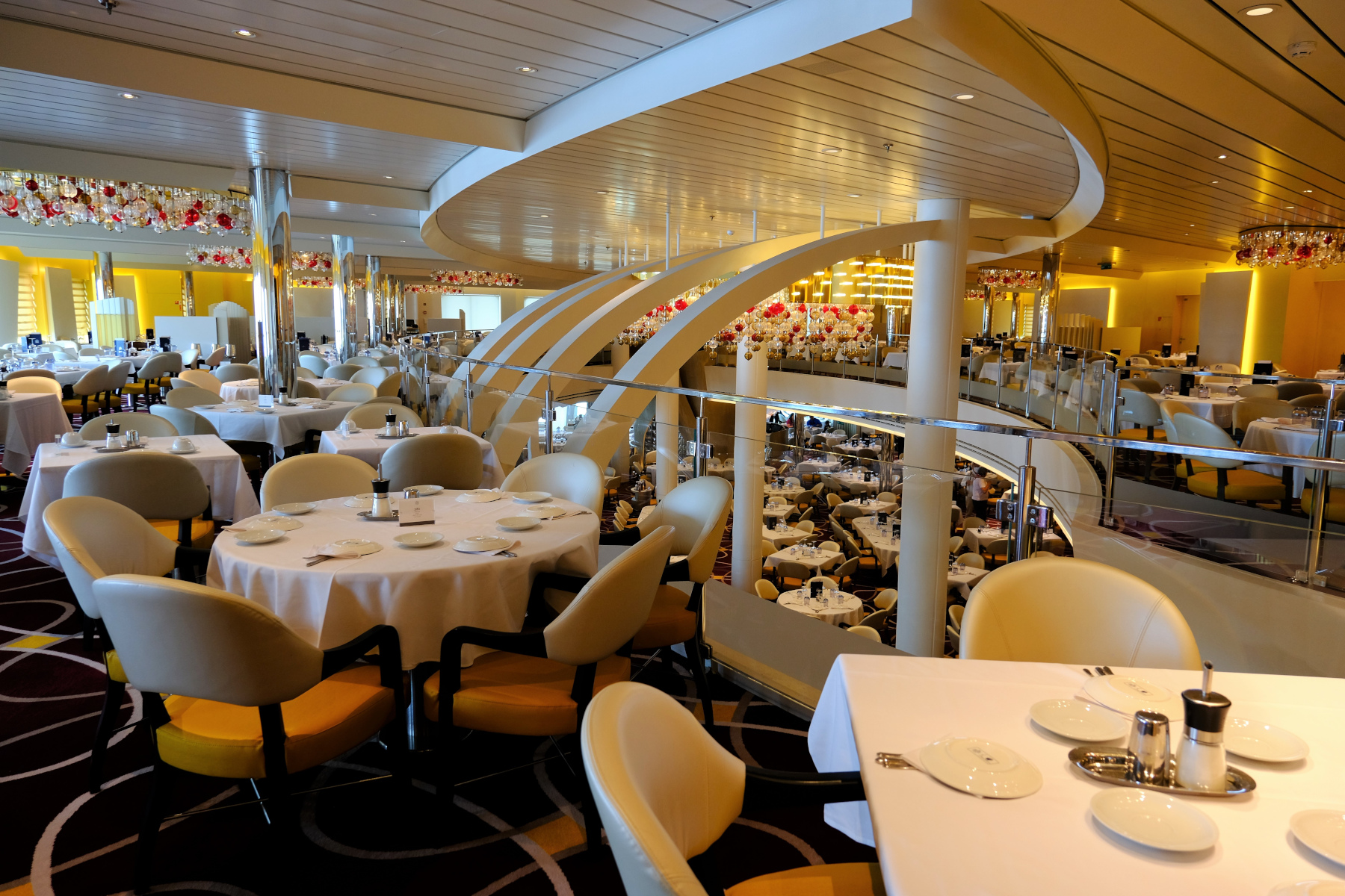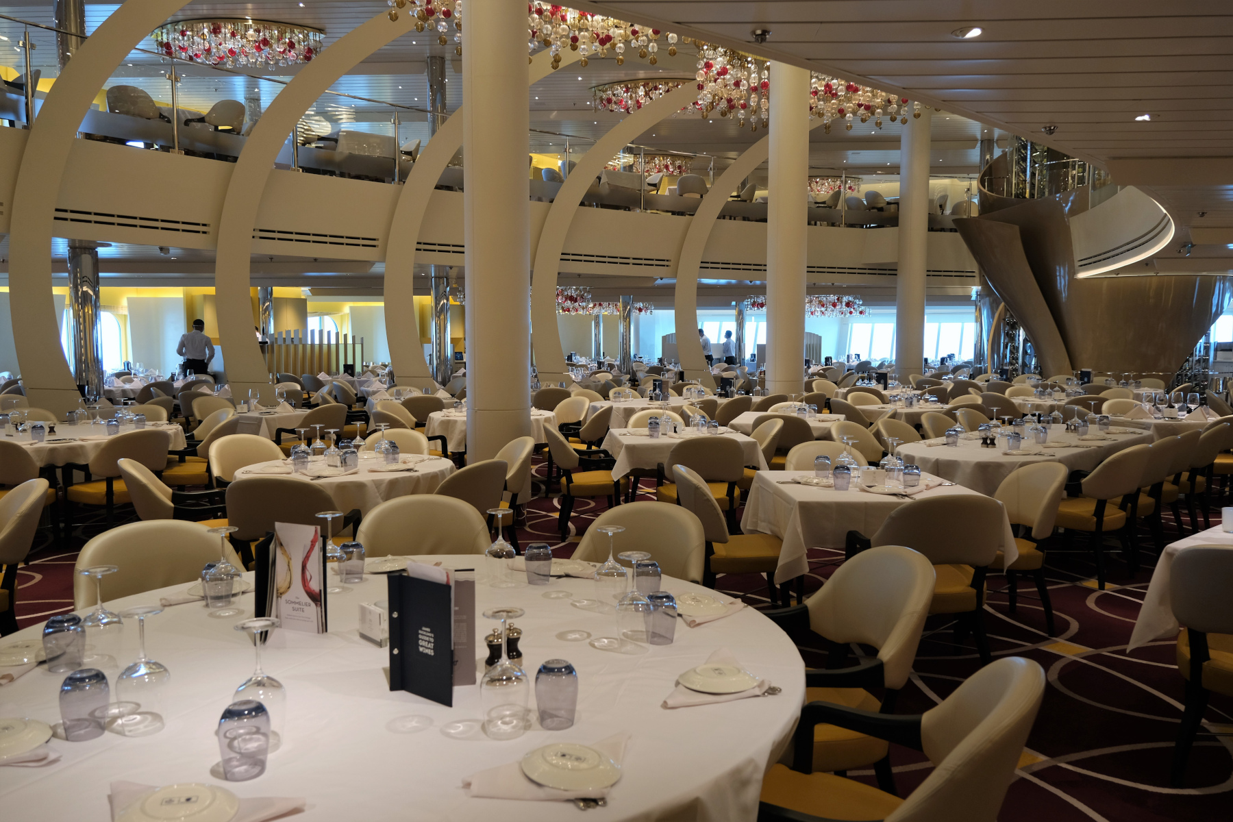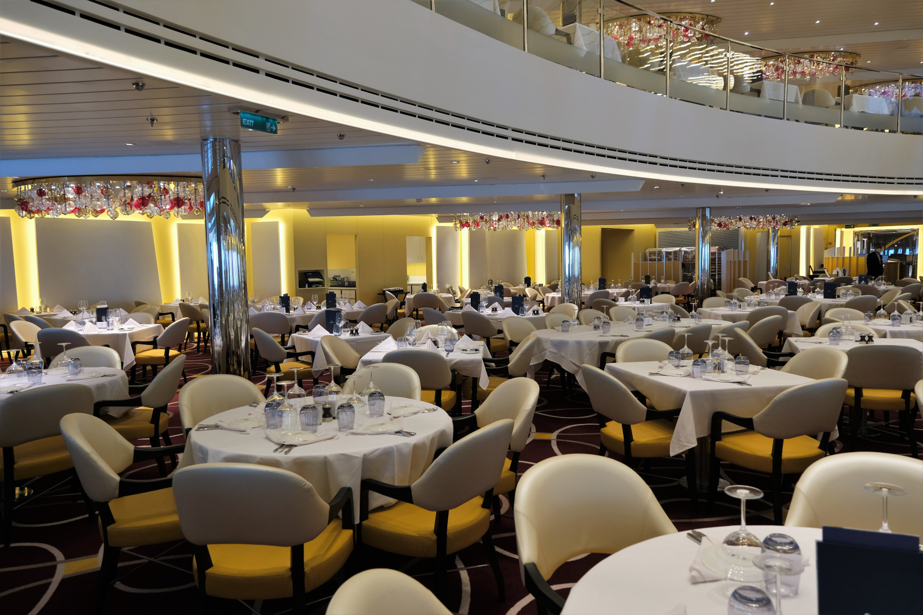 De main dining room is te vinden aan de achterkant van het schip, zowel op dek 2, Plaza Dek, als zoals hier op dek 3, Promenade dek.