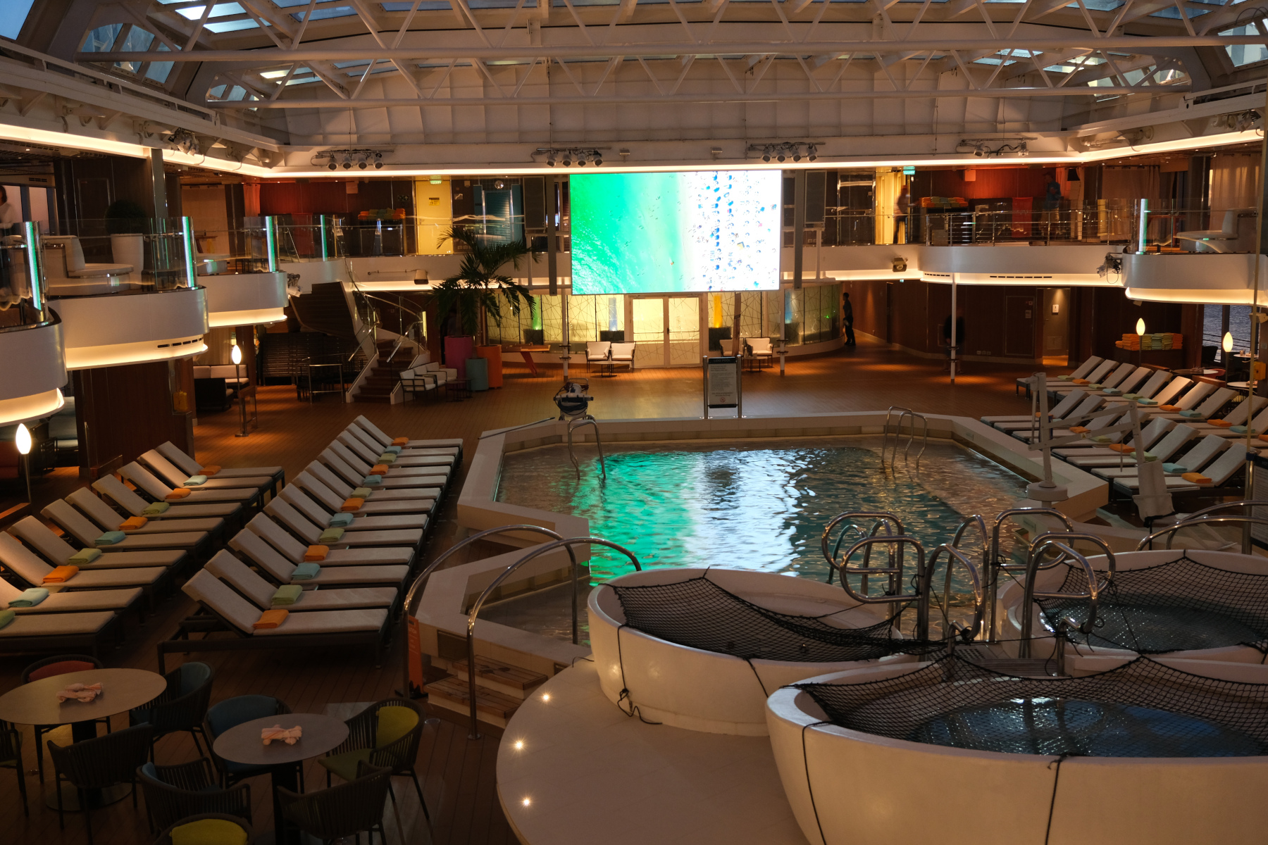 Als we in het atrium staan op dek 1, 2 of 3 en we kijken naar boven, dan zien we een soort blauwe lucht. Met wolken die bewegen. Overdag zien gasten een azuurblauwe lucht en in de avond een sterrenhemel.