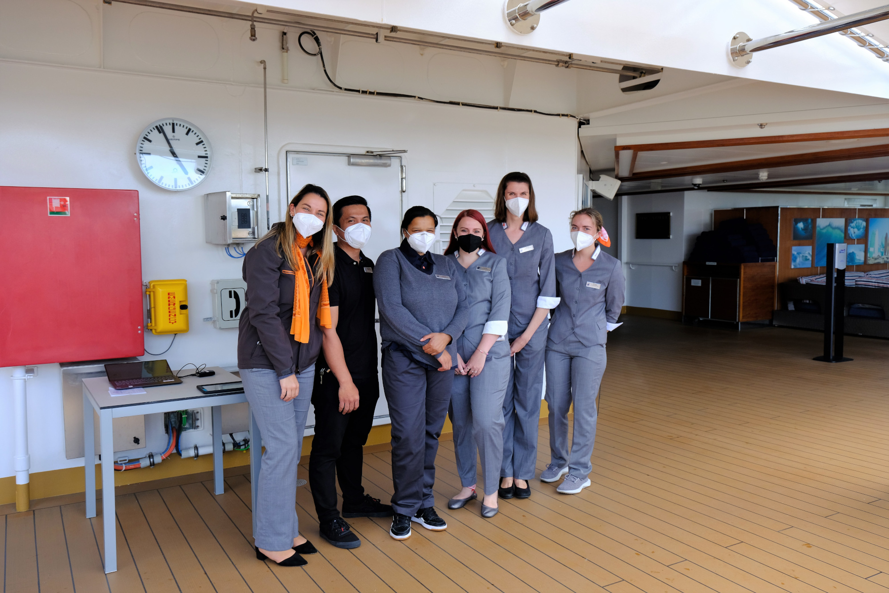 Tijdens de corona periode poseerde het Wellness team van het ms Nieuw Statendam met mondkapjes.