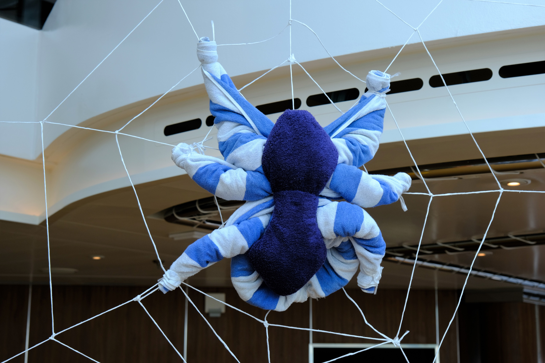 De spin in het web. Gemaakt van handdoeken aan boord.