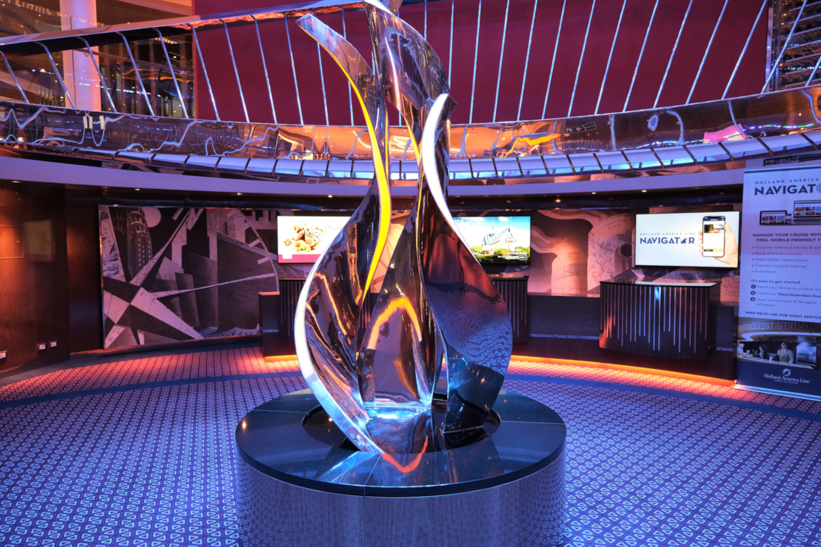 In het atrium op dek 1 is altijd wel een tentoonstelling van kunstwerken. Dit het vaste kunstwerk. Het is een onderdeel van de snaren van de harp aan de railing van de bovenste dekken