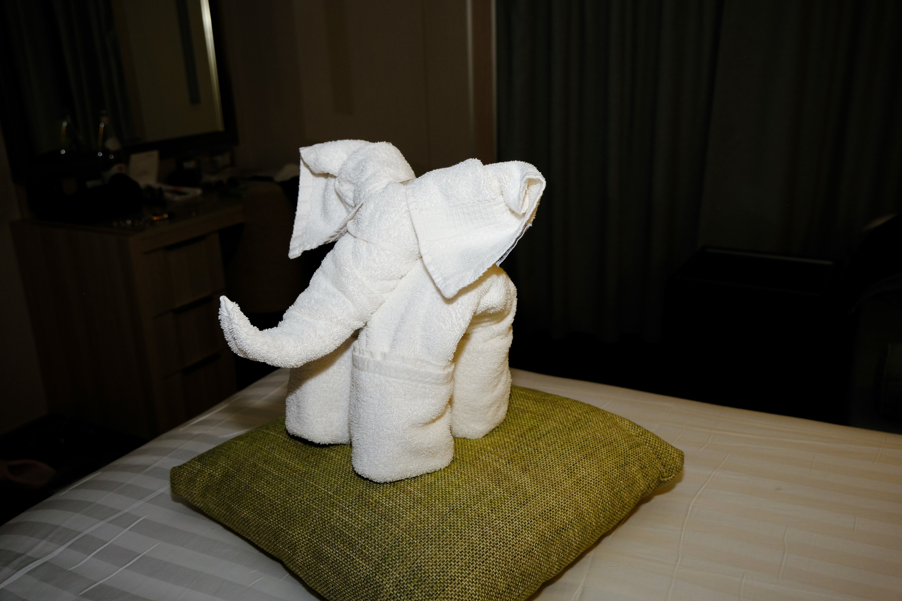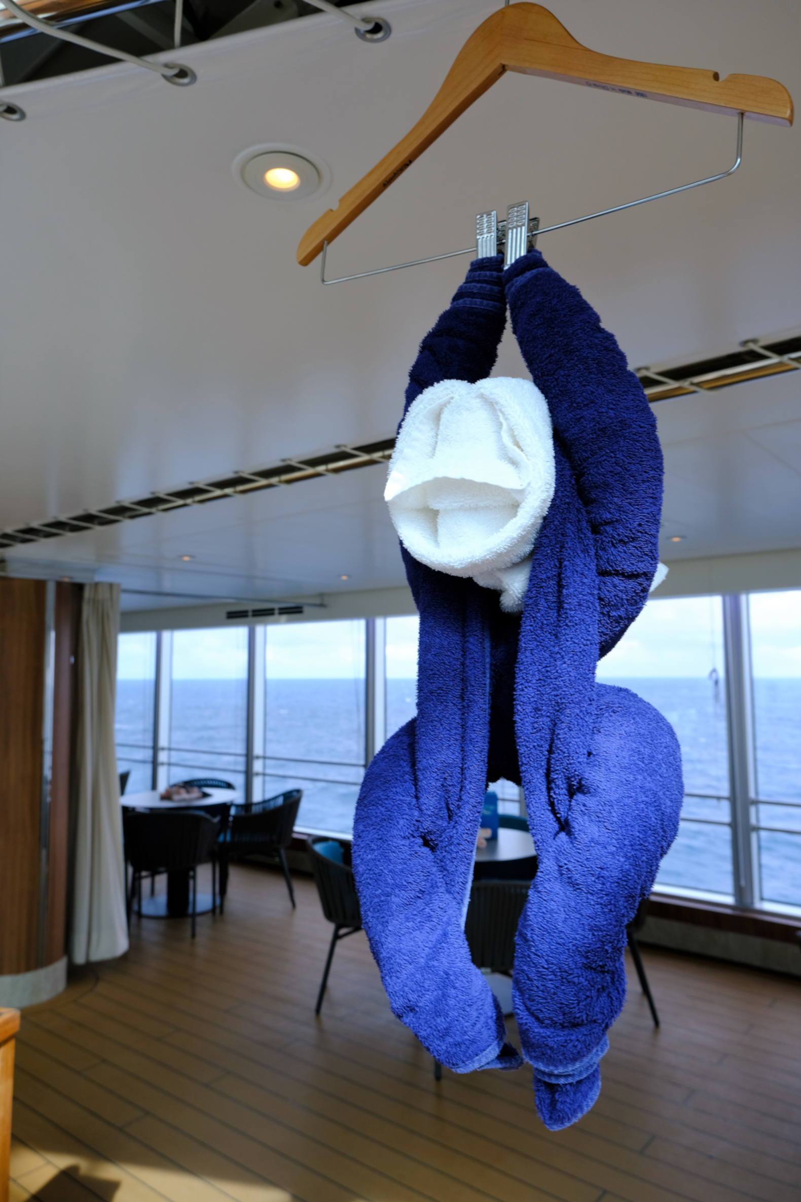 Na een gala diner, tegenwoordig Dressy genoemd, staat er altijd een door de steward gemaakt kunstwerkje van handdoeken. In dit geval een olifant. Na de Gala avond liggen er ook altijd twee chocolaatjes in de hut. Inderdaad, vroeger elke avond, nu alleen met Gala (Dressy)