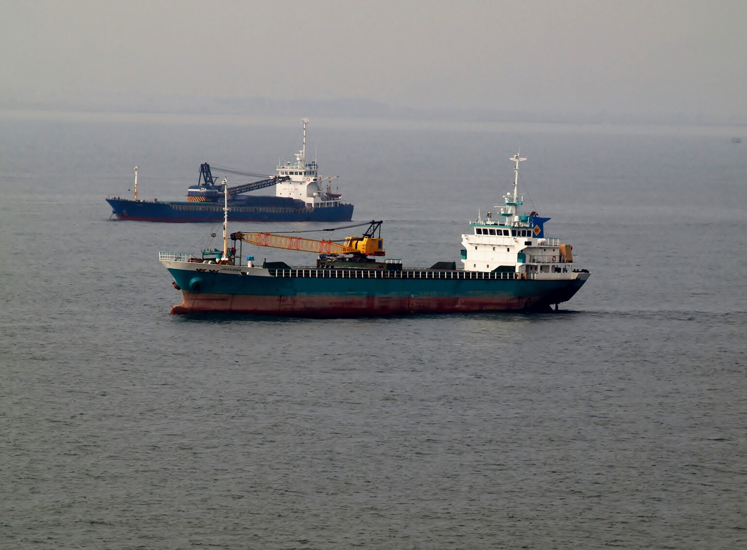 mv Maple Ocea en Phu An 268 in Tandjong Priok, de haven van Jacarta. Sleepboot SDS 36 komt er aan