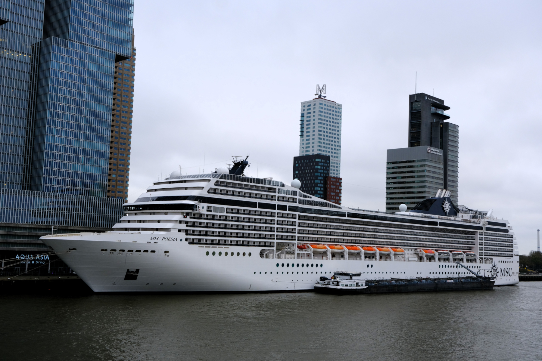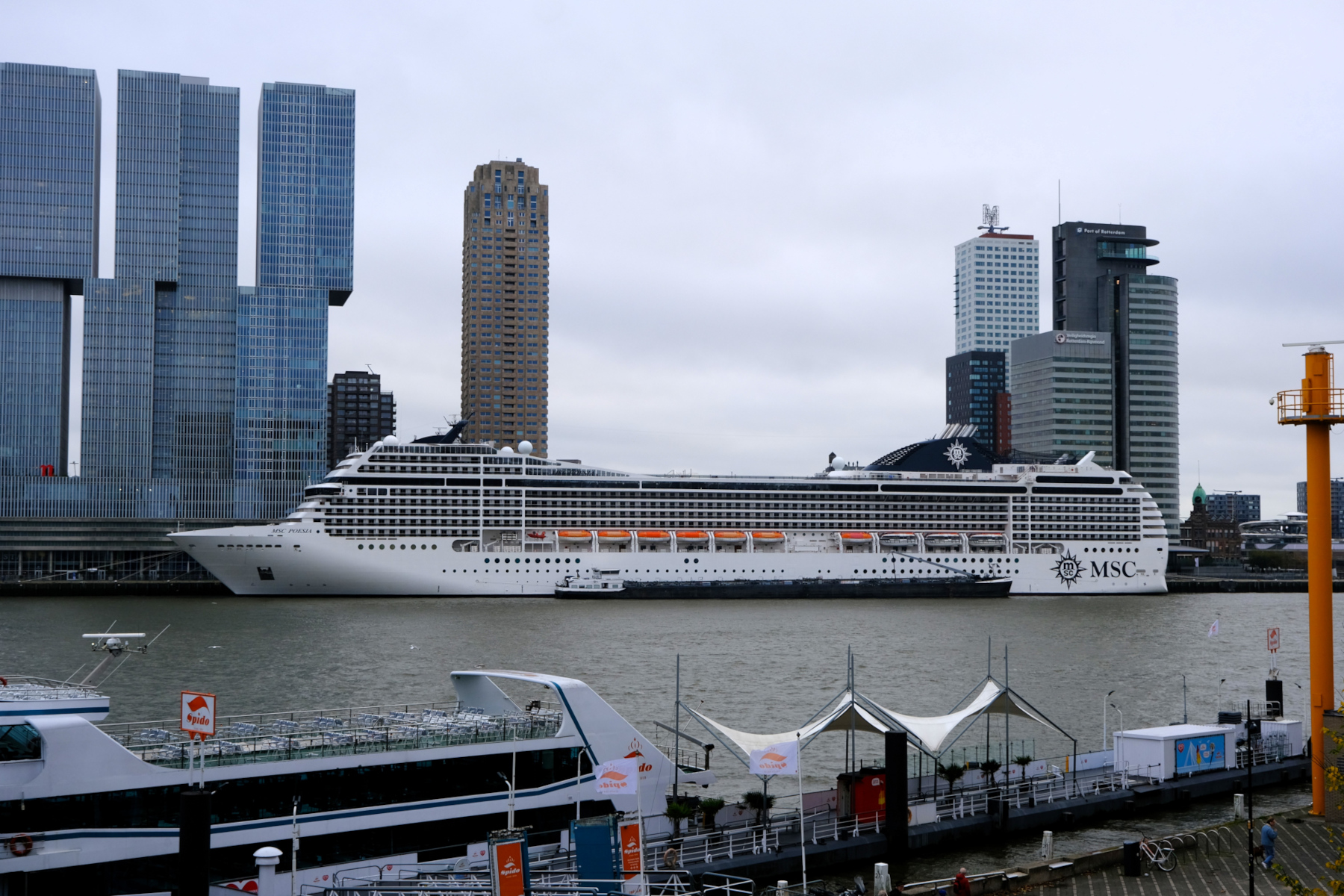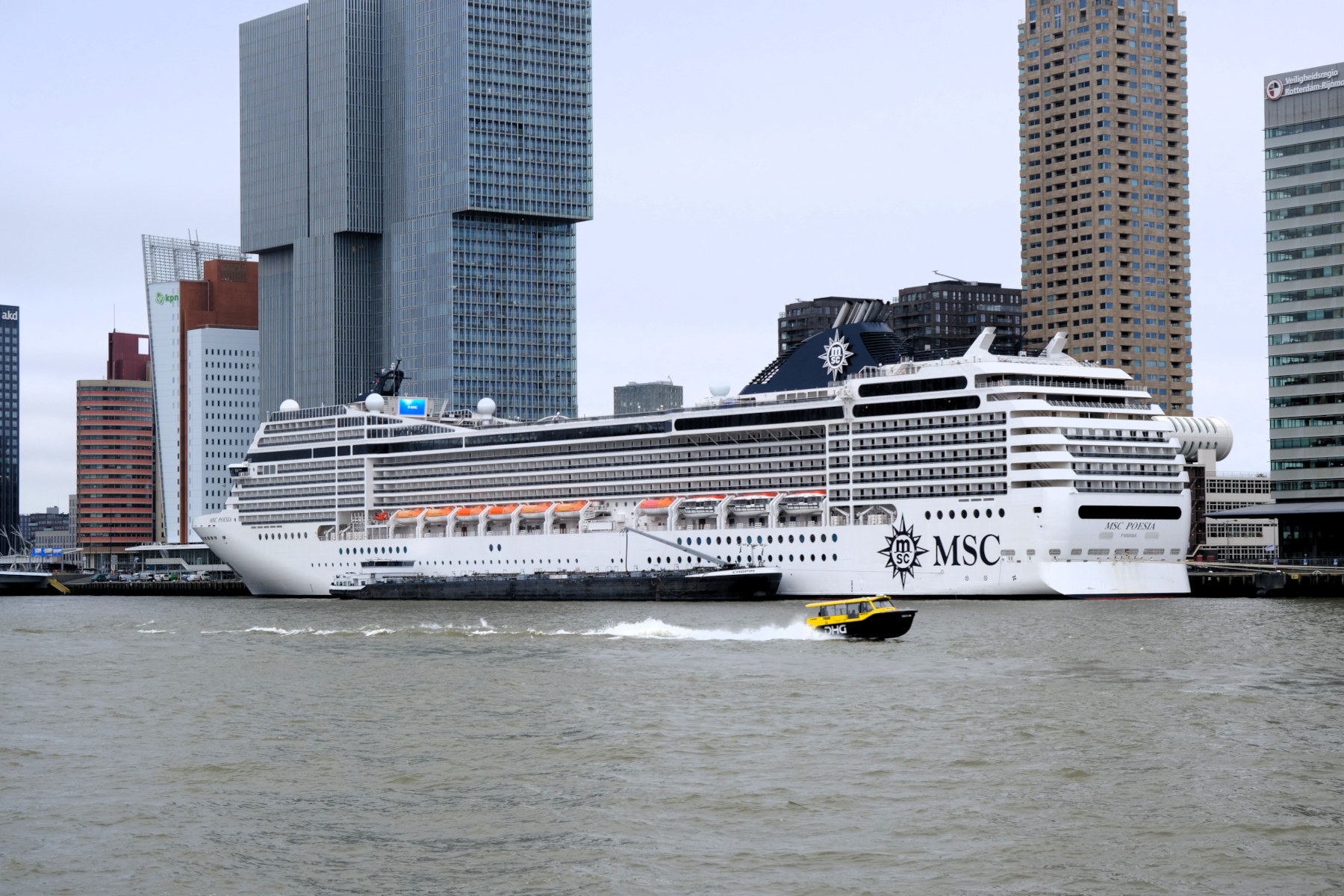 MSC Poesia vanaf de Erasmusbrug met de Spido op de voorgrond