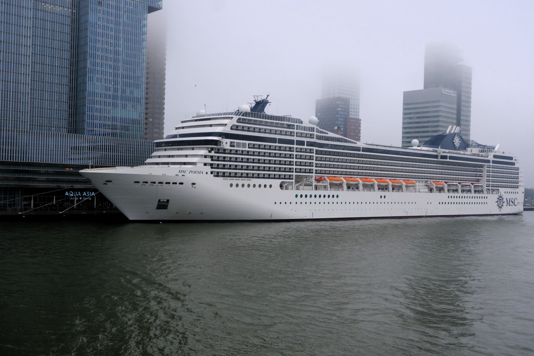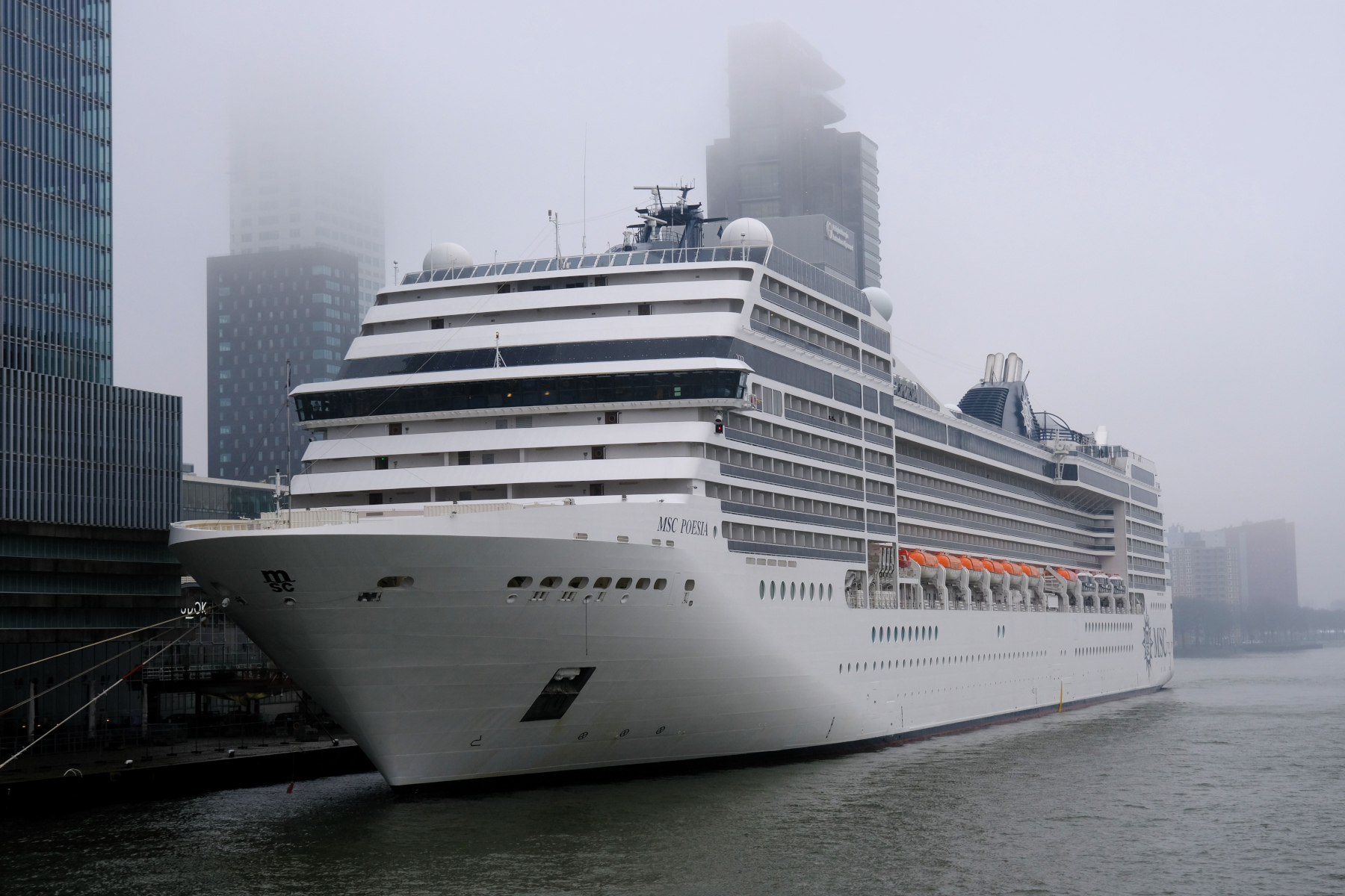 De MSC Poesia aan de Holland Amerikakade met de gebouwen in de mist of lage bewolking