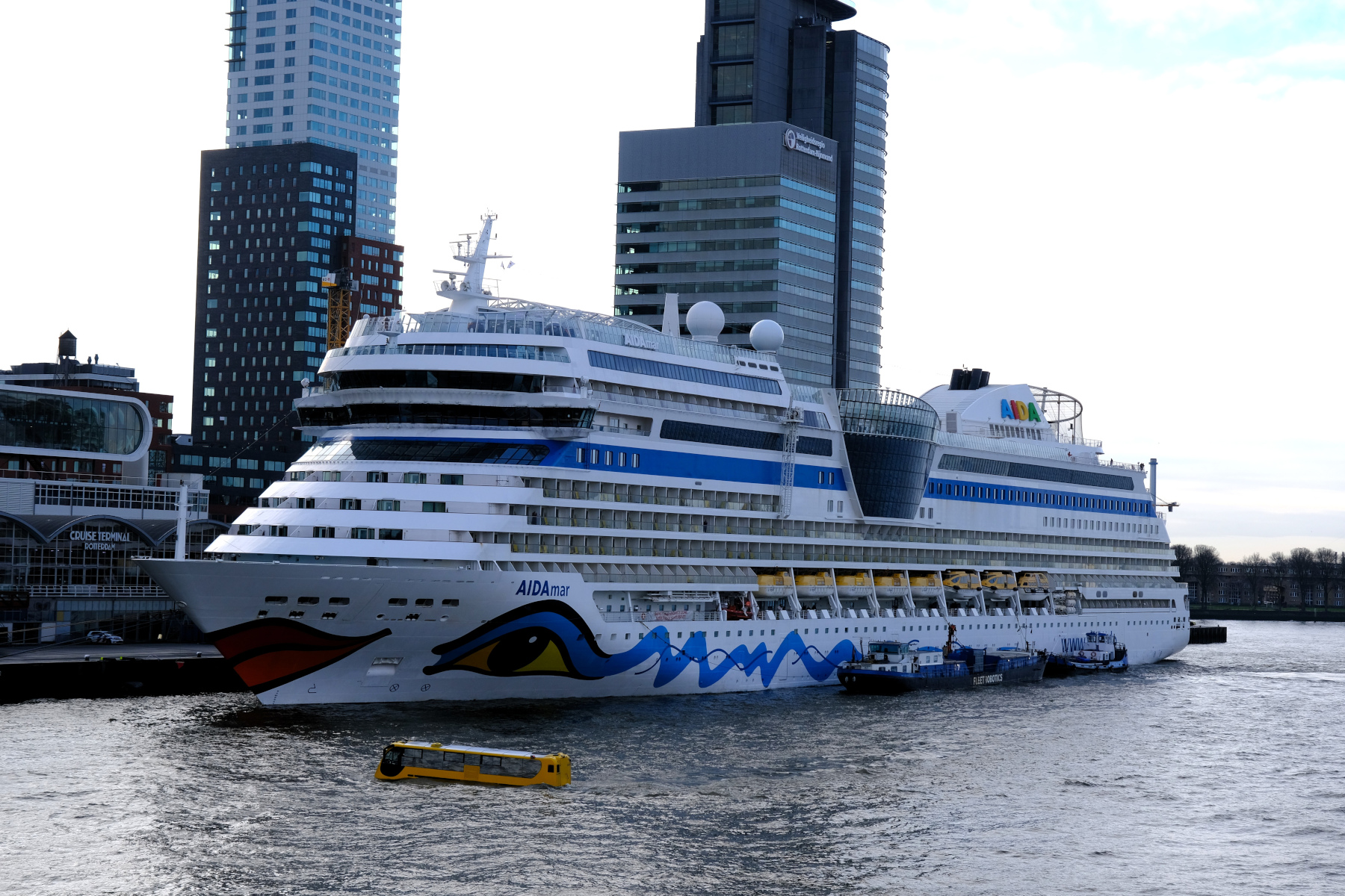De AidaMar vanaf de Erasmusbrug. De bus van Splashtours op de voorgrond